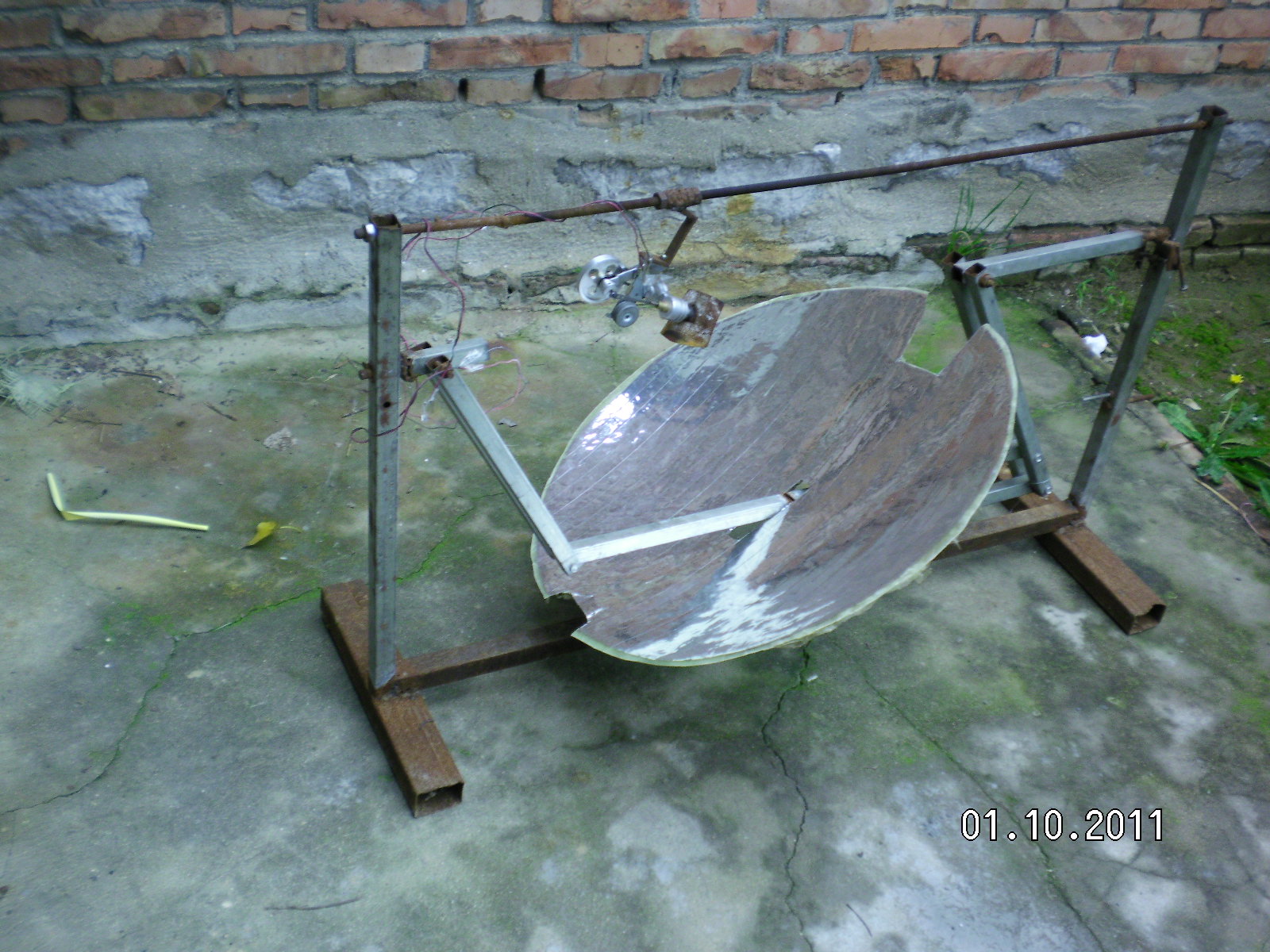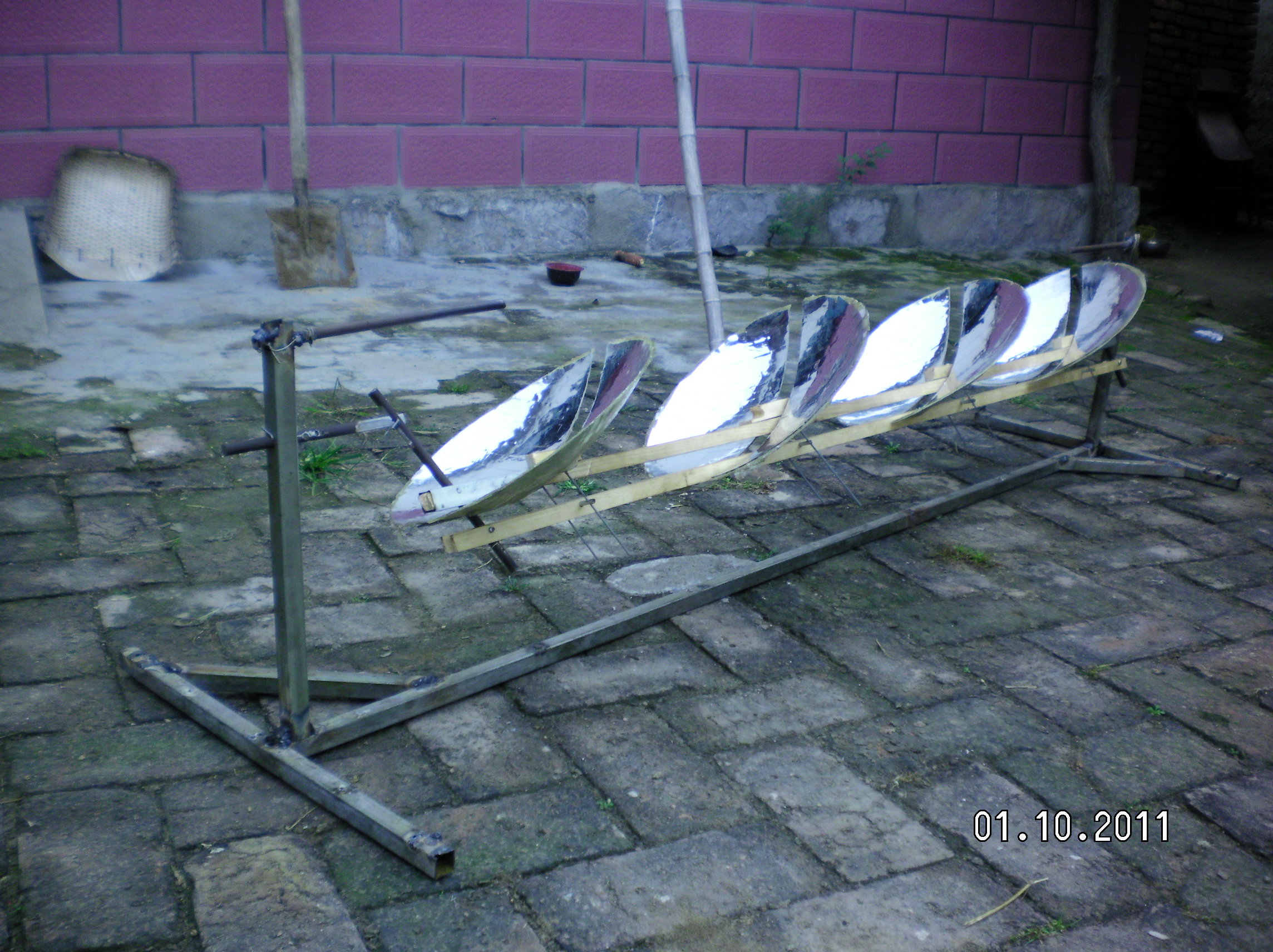 隨著全球環(huán)境惡化和日益嚴峻的能源形勢世界各國對太陽能熱發(fā)電越來越重視。現(xiàn)在最常用的太陽能熱發(fā)電系統(tǒng)主要有槽式、蝶式和塔式,槽式和蝶式的光熱部件必須隨聚光鏡做相應(yīng)的運動,槽式各個光熱部件復(fù)雜昂貴,蝶式光熱部分只能單獨使用塔式的受熱部分出現(xiàn)故障很難維修這三種系統(tǒng)都有自己的缺點。基于此我設(shè)計了平行定焦太陽能聚光集熱發(fā)電系統(tǒng):主要有一對支柱.一對轉(zhuǎn)軸.一對動臂.旋轉(zhuǎn)拋物面聚光鏡.一根托桿.一根平行桿.平行連桿組成將兩支柱固定在一條直線上,兩轉(zhuǎn)軸安裝在兩支柱上兩轉(zhuǎn)軸可以左右轉(zhuǎn)動,兩動臂安裝在兩轉(zhuǎn)軸上使可以隨轉(zhuǎn)軸左右前后擺動。托桿安裝在兩動臂上,平行桿與托桿平行安裝在兩動臂上,這樣動臂.托桿.平行桿構(gòu)成一個平行凹框。在旋轉(zhuǎn)拋物面鏡原點安一橫軸并切去部分旋轉(zhuǎn)拋物面鏡,在橫軸兩端垂直安裝兩根平行連桿,把旋轉(zhuǎn)拋物面鏡的橫軸安裝在托桿上。在平行桿上安裝連桿軸把平行連桿與連桿軸連接在一起。所述旋轉(zhuǎn)拋物面鏡的焦距等于托桿與轉(zhuǎn)軸之間動臂的長度。將動臂對準太陽陽光就會聚焦到固定點上在這些位置安裝光熱部件就會得到熱能用于熱發(fā)電。這種結(jié)構(gòu)是雙軸定焦所以效率很高,抗風(fēng)性好。這種結(jié)構(gòu)可以做成很小裝在高在15-20cm的透明罩內(nèi)安裝在樓頂或樓房南墻上,為人們提供開水或蒸汽。請看模型照片: