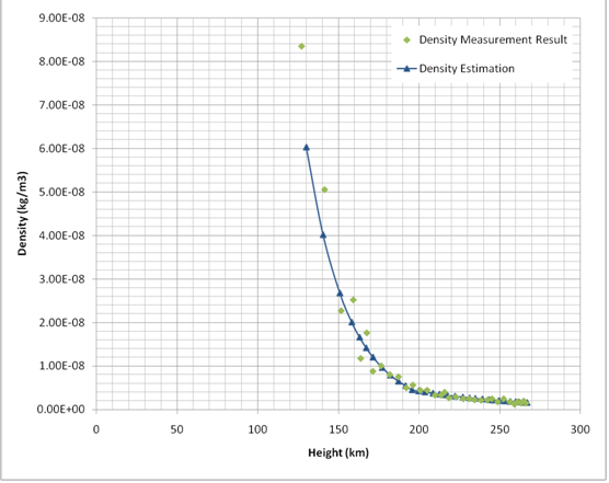 這種模式是否具有實用意義主要取決于離子在工作環境中是否充足, 即是說, 我們首先必須先測出高層大氣的近似的密度. 又因為它太小, 無法直接測量, 我就想出一種間接的方法: 通過測量不受控制的近地軌道衛星的軌道高度的自然衰減. 由于密度可由作用于衛星上的大氣阻力大小求出, 這個阻力間接地體現在衛星高度衰減上, 因此通過計算我們得出密度ρ (kg/m3 ):