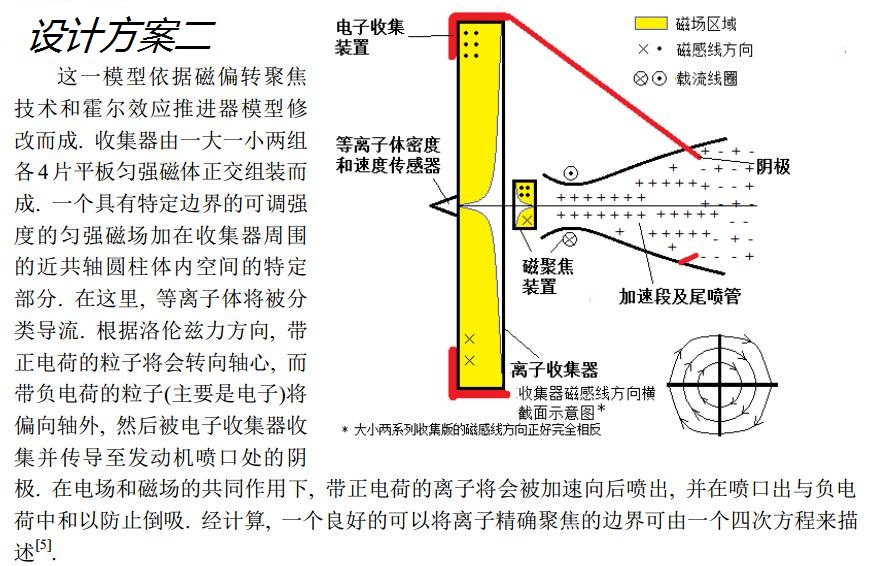 這一事實讓我想起了使用的離子推進器的衛星, 如SMART和DAWN衛星等. 離子推進器的廣泛應用說明了人類在短距離小空間內加速離子的技術日臻成熟. 這也同時讓我考慮到一個新的模型——融合傳統離子推進器和沖壓發動機的設計, 讓等離子體代替空氣進入進氣道, 然后使用電場和磁場來加速, 以取代化學燃料的燃燒. 這就是我的想法的概述.